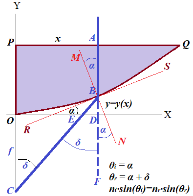 Nice equation above, easily solvable for y(x), unfortunately, has an unknown angle δ. This angle should be determined based on the shape of curve OQ defined by function y=y(x) and the distance x of the incident light from the Y-axis.