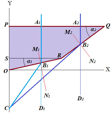 As we see, the necessary condition for these two rays to come to the same point C on the Y-axis is the above formulas that combine the angle between the refracting bottom surface of a prism with the horizontal plane (α1 for OR and α2 for RQ) and the distance of the incoming ray of light from the Y-axis (x1 for PA1 and x2 for PA2).