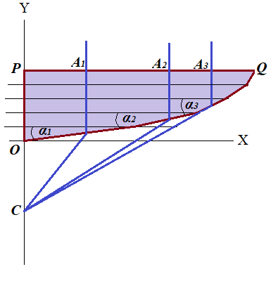 Line PQ is perpendicular to the Y-axis, curve OQ can be represented by some function y=y(x), which would be desirable to find, based on certain properties of a lens, which we need to have, primarily, its ability to concentrate the parallel rays of light falling perpendicularly to its top surface in one point on the Y-axis called the focal point.