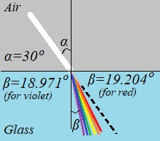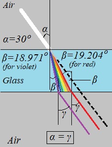Simple calculations for the glass of 2.5 mm thickness show that the white light coming at the incident angle of 30° will be split into different colors in such a way that the distance between outgoing parallel red and violet rays will be only
