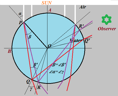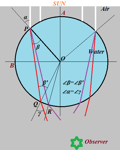 Then the whole spectrum of these colorful rays reflects from the inside of a water surface to points from Q' to R'.