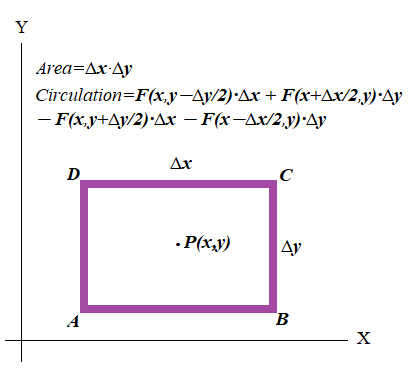 Similarly, we can assume that the Y-component of the vector field Fyy(x,y) is constant along the vertical sides of a rectangle and equals to its value in the middle of a corresponding side, that is Fy(x+½Δx,y) for side BC and Fy(x−½Δx,y) for side DA.